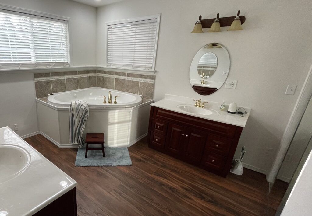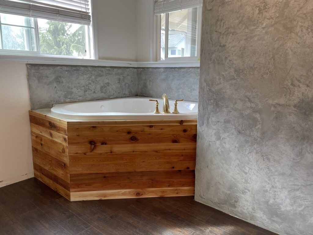 A complete bathroom renovation from scratch! The client gave us creative freedom, so we took liberties to create the space using our signature cedar look to build a slatted cedar wall. We built out a new shower space and coated the walls with Deco Poz micro topping cement.