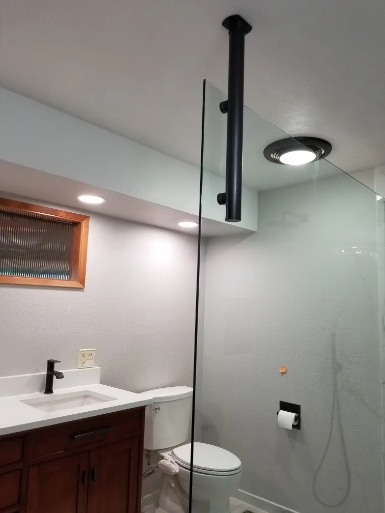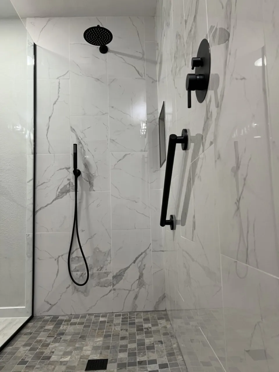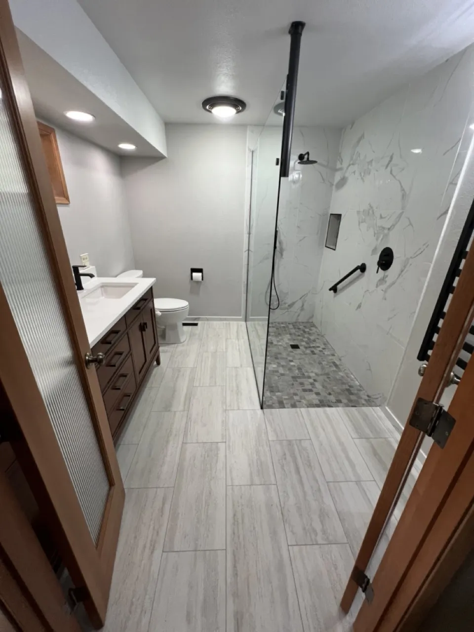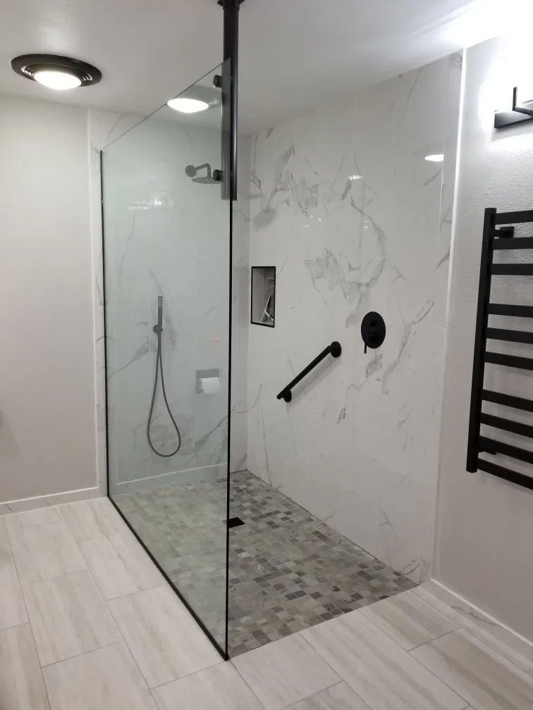For their bathroom remodel, our client decided to go with larger profile tiles to replicate the high-end marble look at the cost of porcelain tile. With a curbless entry into the shower, we waterproofed the entire floor, which allowed for a simple glass panel to contain the water without dealing with the swing of a heavy glass door.